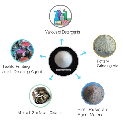 Properties: Melting point is 1089 ℃ . It is easily dissolved in water and difficult dissolved in ethanol and acid. The solution is slightly alkaline. It is easily to absorb moisture when it is stocked in the open air. It has characters of decontamination, decentralization, wetness, penetrability, and PH value buffer capacity.